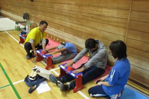 種目は全8種目(3分間歩行・長座体前屈・反復横跳びなど)からやりたいものを受けることができ、また、当会会員清水橋クリニック様の協力により、事前健康チェックも実施しました。