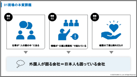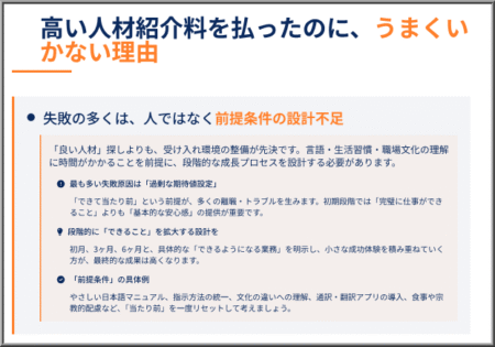 外国人材が社内で生かせない原因は、言葉の壁ではなく「現場の曖昧さ」にあると語られます。